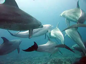 دلفینها از آن روی که آمیزش جنسی را بنا به دلیلهایی به جز هدف تولید مثل انجام میدهند، شناخته شده هستند. دلفینهای نر و ماده گاه آمیزشهایی همچون نزدیکی از راه سوراخ تنفسی انجام میدهند که آشکارا سودی در جهت زایش ندارد. گاهی نر آلت تناسلی خود را بر روی بالههای پشتی و کناری ماده میمالاند و این کار به ویژه هنگامی که ماده اجازه آمیزش واژنی به نر نمیدهد صورت میگیرد.[63] خودارضایی در هر دو جنس دیده میشود و دلفینها یا به وسیله تماس یکی از بالههای خود به ناحیه تناسلی یا مالاندن آن ناحیه به کف دریا، به ارضای خود میپردازند.[64]