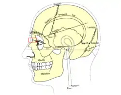 ![]() Side view of head, showing surface relations of bones. (Nasion labeled at center left.) | |
