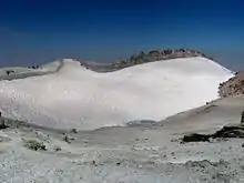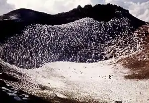 قطر دهانهٔ این آتشفشان در حدود ۴۰۰ متر است[29][30] که دریاچهای از یخ آن را پوشانده[31] و دودخانهایی در اطراف آن وجود دارد.[32] همچنین نشانههایی از وجود دهانههای قدیمی و کاسههای آتشفشانی در پهلوهای جنوبی و شمالی کوه ملاحظه میشوند که قطر کاسهٔ شمالی به ۹ کیلومتر میرسد.[31][33]