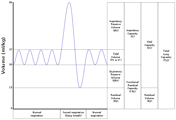 - ظرفیت حیاتی (Vital Capacity) یا VC: حداکثر حجم هوایی است که میتوان پس از یک دم عمیق با یک بازدم عمیق از ششها خارج کرد. (نمودار مقابل)