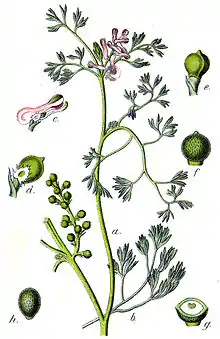 | بابونه آلمانی کامومیل | matricaria recutita مترادف Matricaria chamomilla | ![]() | گل | در اصل این گیاه بومی کشور مصراست. از چند صد سال قبل برای درمان بیخوابی، دردهای عصبی، دردهای هنگام قاعدگی در زنان بکار میرود. به علت خاصیت جمعکنندگی رحم بهتر است در هنگام حاملگی مصرف نشود. بوی آن همانند بابونه رومی به سیب شیرین شباهت دارد اما از نظر طعم بابونه رومی اندکی طعم تلخی دارد.[47] غنچههای بابونه آلمانی اثر ضد تورمی، ضدعفونیکننده، معرّق و مسکّن دارد این گیاه بخصوص در طب کودکان مورد استفاده است. دم کردهٔ آن برای درمان گریپ (تعریقکننده و آرامکننده)، ناراحتیهای معده-رودهای یا اسهال بکار میرود. خصوصاً اثر ضدعفونیکنندهٔ آن در درمان ورمهای مجاری ادراری مؤثر است.[48] |