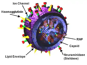 آنفلوانزا، که معمولاً با آنفلوآنزا شناخته میشود، یک بیماری عفونی پرندگان و پستانداران است که در اثر ویروس RNA خانواده ارتومیکسوویریده (ویروسهای آنفلوانزا) ایجاد میشود. در انسان، از نشانههای عفونت آنفلوانزا عبارتند از: تب، گلودرد، دردهای ماهیچه، سردرد شدید، سرفه و ضعف و خستگی.[7] در موارد جدیتر، آنفلوانزا باعث سینهپهلو میشود، که میتواند به ویژه در کودکان خردسال و سالمندان، کشنده باشد. گرچه گاهی با سرماخوردگی اشتباه گرفته میشود، در آنفلوانزا این نشانههای بیماری بسیار شدیدتر است و در اثر نوع دیگری از ویروس ایجاد میشود.[8] هرچند این تهوع و استفراغ میتواند به ویژه در کودکان ایجاد شود،[7] ولی این نشانهها بیشتر در رابطه با مشکل دستگاه گوارش است، که گاهی هم "آنفلوآنزای معده" یا "آنفلوآنزای ۲۴ ساعته" خوانده شدهاست."[9]