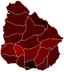 ![]() Departments of Uruguay with confirmed COVID-19 cases (as of 24 January 2021) Confirmed 1~4 Confirmed ۵~9 Confirmed ۱۰~49 Confirmed ۵۰~99 Confirmed ۱۰۰~499 Confirmed ۵۰۰~999 Confirmed ۱۰۰۰~4999 Confirmed ۱۰۰۰۰~۴۹۹۹۹ | |