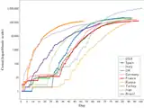 نمودار نیمه لگاریتمی نمایشگر شمار تجمعی افراد مبتلا در ده کشور دارای بیشترین میزان ابتلا از تاریخ نخستین گزارش[103]