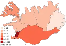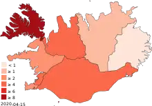 ![]() Map of the pandemic in Iceland, number of cases per 1000 inhabitants. | |