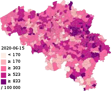 ![]() نقشه بلژیک و استانهای آن با گسترش کووید-۱۹ از تاریخ ۳ آوریل ۲۰۲۰[1] | |