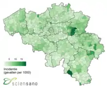 برخلاف بیشتر کشورهای همسایه (هلند، فرانسه، آلمان و UK), مقامات بلژیک در ابتدا مایل به ارائه اطلاعات یا آماری درمورد محل قرارگیری پروندهها نبودند، غیر از آمار مربوط به هر منطقه: فلاندر، بروکسل و والونیا.[7] Sciensano از ۱۸ مارس به بعد و برای هر شهرداری از ۲۶ مارس به بعد شروع به انتشار آمار در هر استان کرد.