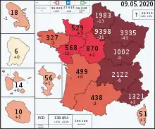 ![]() ناحیههای فرانسه با تعداد افرادی که در اوایل ماه مه بستری شدهاند.