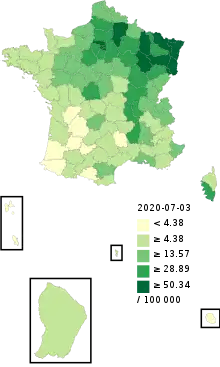 ![]() مرگ و میر به ازای هر ۱۰۰٬۰۰۰ نفر از ساکنان بر پایه دپارتمان | |