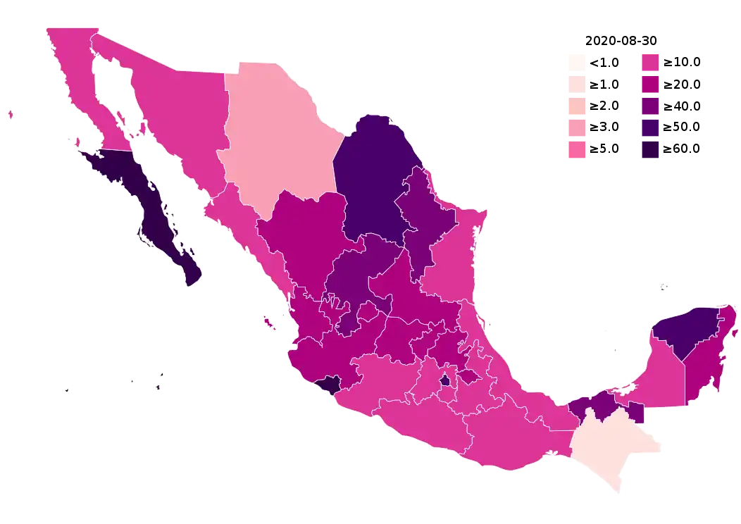 ![]() Map of the outbreak in Mexico by increase or decrease of confirmed new infections per week (as of August 11; week 31) | |
