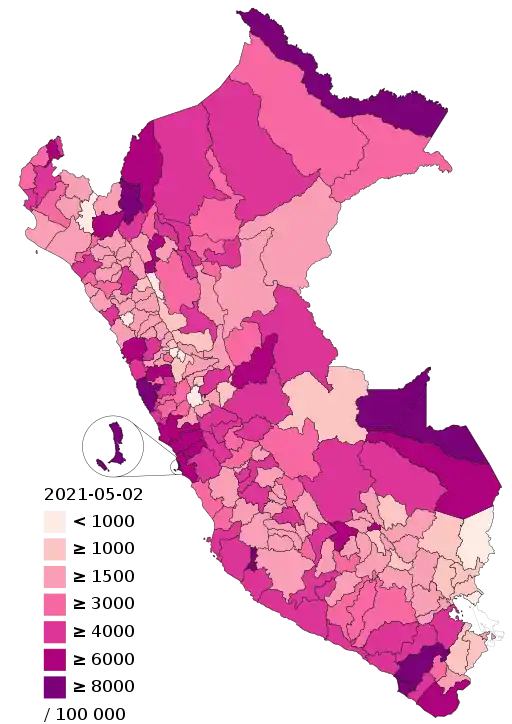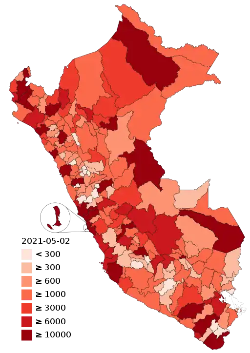 Confirmed cases of COVID-19 per 100,000 inhabitants in Peru by province | |