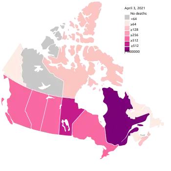 ![]() Total deaths per million inhabitants by province/territory | |