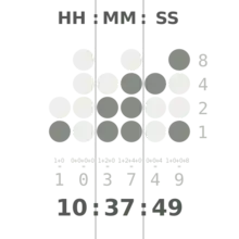 ساعت باینری یکی از کاربردهای کد BCD است که سازوکار آن طبق اصول باینری است، این ساعت، پاراتمترهای ساعت، دقیقه و ثانیه در دو ستون با چهار سطر نشان داده میشود، مطابق شکل سطر اول رقم ۱، سطر دوم ۲، سطر سوم ۴، و سطر آخر رقم ۸ است، ستون سمت چپ رقم دهگان و ستون سمت راست رقم یکان را نشان میدهد که با جمع ارقام هر ستون و جمعبندی آنها با هم عدد ساعت، دقیقه و ثانیه به دست میآید.