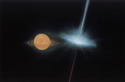 و بدین گونه است که بادهای خورشیدی عظیمی که موجبش گرانش همدم است از ستاره بزرگتر وزیده و به سمت جسم فشرده روانه میشود.