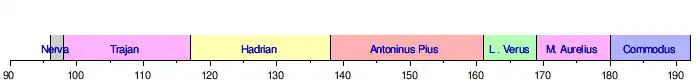 - توجه: مارکوس اورلئوس از سال ۱۶۱ تا زمان مرگ وروس در سال ۱۶۹ با لوسیوس وروس پادشاهی میکرد.