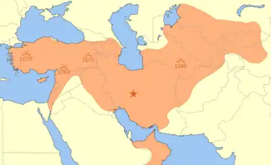 - «Encyclopaedia Britannica». ص. Seljuq, also spelled Seljuk, ruling military family of the Oğuz (Ghuzz) Turkic tribes" that invaded southwestern "Asia in the ۱۱th century and eventually founded "an empire" that included Mesopotamia, Syria, Palestine, and most of Iran٫ Their advance marked the beginning of Turkish power in the Middle East٫.