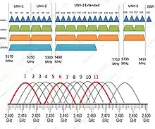 در باند فرکانسی ۲٫۴ حتی اکثر کانال ها همپوشانی دارند و همانطور که در شکل زیر میبینید تنها سه کانال ۱،۶،۱۱ با هم هیچ تداخلی ندارند.اما در باند فرکانسی ۵ گیگاهرتز علاوه بر اینکه تعدّد دستگاه های استفاده کننده بسیار کمتر از ۲٫۴ می باشد، هیچ تداخلی هم بین کانال های آن وجود ندارد.