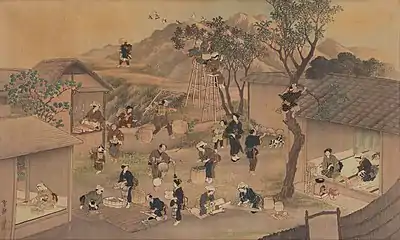 اثر نشاندادن کشت و تولید برنج، چای و ابریشم را بهتصویر کشیدهاست. امضا شده توسط Sekka و با مهر قرمز (سلطنتی)، مربوط به دورهٔ مِیجی، از مجموعهٔ خلیلی (en).