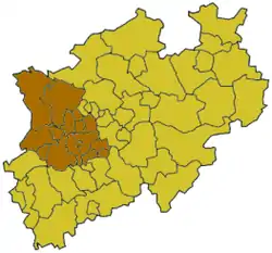 ![]() نقشهٔ ایالت نوردراین-وستفالن؛ قسمت روشنشده، منطقهٔ دولتی دوسلدورف (منطقه) را نشان میدهد. | |