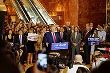 در ۱۶ ژوئن ۲۰۱۵، ترامپ کاندیداتوری خود برای کسب نامزدی حزب جمهوریخواه در انتخابات ریاست جمهوری ۲۰۱۶ را از مقر خود در برج ترامپ در نیویورک اعلام کرد. ترامپ توجهات را در کارزاری که شدیداً بر شعار «عظمت را به آمریکا برمیگردانیم.» تکیه داشته، معطوف به مسایل داخلی ای نظیر مهاجرت غیرقانونی به ایالات متحده آمریکا، انتقال به خارج مشاغل آمریکاییها، بدهی ملی ایالات متحده آمریکا، و تروریسم اسلامی کرد.[187]