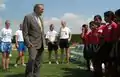 رامسفلد در دیداری از تیم فوتبال نوجوانان دختر افغانستان در سال ۲۰۰۴.