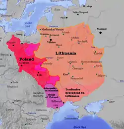 ![]() لهستان و لیتوانی تحت فرمان یوگایلا در اواخر قرن ۱۴ میلادی | |||||||||