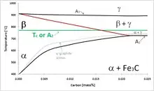 به همین ترتیب، A2 در مقایسه با دماهای بحرانی A1 (یوتکتوئید)، A3 و Acm از اهمیت کمی برخوردار است. Acm، جایی که آستنیت با سمنتیت + آهن گاما در تعادل ترمودینامیکی است، در شکل ۱ راستتر از لبهی راست نمودار است. میدان فاز آهن آلفا + گاما، در واقع همان میدان بتا + گاما بالای A2 است.