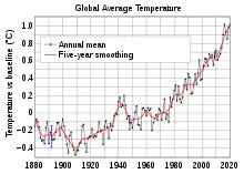اجماع علمی این است که اقلیم زمین بی شک در حال گرم شدن است و این شدیداً محتمل است (یعنی با احتمال اقلاً ۹۵٪ یا بیشتر) که انسانها بیشتر آن را از طریق اقداماتی که تمرکز گاز گلخانهای را در جو زمین، با اقداماتی چون جنگلزدایی و سوزاندن سوخت سنگوارهای انجام میدهند. علاوه بر این محتمل است که برخی گرم شدنهای ناشی از گازهای گلخانهای با افزایش هواپخشها جبران شده باشد.[2][3][4][5]