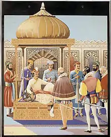 این مینیاتور در کتاب اکبرنامه، توسط نار سینگ در حدود ۱۶۰۵ میلادی کشیده شده