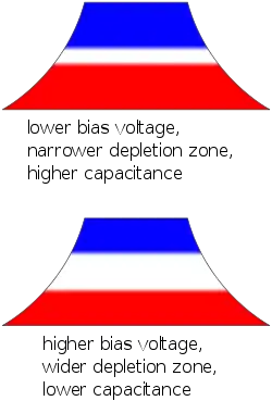 دیودخازنیها در بایاس معکوس کار میکنند، بنابراین جریانی از دیود نخواهد گذشت. ولی زمانی که پهنای ناحیه تخلیه بر اثر ولتاژ بایاس دیود، تغییر کند، میزان ظرفیت خازنی دیود نیز تغییر میکند. عموماً پهنای ناحیه تخلیه به مجذور ولتاژ اعمالی بستگی دارد و ظرفیت خازنی دیود نسبت معکوسی با پهنای ناحیه تخلیه دارد. بنابراین ظرفیت خازنی دیود با مجذور ولتاژ ورودی نسبت معکوس دارد.