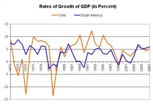 از نقطه نظر اقتصادی، این دوران را میتوان به دو بازه زمانی تقسیم کرد. اولی از ۱۹۷۳ تا ۱۹۸۲ مربوط به بازهای است که بیشتر اصلاحات در حال پیادهسازی بودند. این بازه با بحران جهانی بدهی و فروپاشی اقتصاد شیلی پایان یافت. در این نقطه، بیکاری بسیار زیاد، و بالای ۲۰ درصد بود، و بخش بزرگی از بخش بانکداری ورشکسته شده بود. مشخصهٔ بازهٔ پس از آن اصلاحات جدید و بازیابی اقتصادی بود. برخی اقتصاددانان استدلال میکنند که بازیابی به خاطر تغییر جهت تقریباً کامل سیاست بازار آزاد پینوشه بود زیرا او بسیاری از صنایعی را ملی کرد که در دورهٔ آلنده ملی شده بودند و پسران شیکاگو را از مناصب حکومتی برکنار کرد.[4]