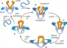 در هنگامی که دیانای ژیراز به رشتهٔ دیانای متصل میشود، همانطور که در قسمت قبل به آن اشاره کردیم دو مولکول ATP که شامل بستههای انرژی هستند به ساختار آنزیم میچسبند و باعث تغییر شکل در قسمت GyrB شده و در نتیجه قسمت جابهجا شوندهٔ رشته DNA در بین زیربخشهای قسمت GyrB آنزیم قرار میگیرد. در مرحله بعد قسمت gate-segment دیانای (در شکل نشان داده شدهاست) در DNA-gates آنزیم قرار میگیرد و که باعث پارهشدن هر دو رشتهٔ دیانای میشود. سپس با هیدرولیزه شدن یکی از مولکولهای ATP متصل شده، قسمت جابهجا شونده دیانای (در شکل با عنوان T-segment نمایش داده شدهاست) از بین T-segment که گسسته شدهاست، عبور میکند. در انتها آنزیم ناحیهٔ پاره شدهٔ رشته دیانای یعنی G-segment را پیوند میزند و در انتها T-segment از ساختمان آنزیم دیانای ژیراز خارج میشود. با هیدرولیزه شدن مولکول ATP دوم، ساختار آنزیم به حالت اولیهٔ خود بازمیگردد.[6]