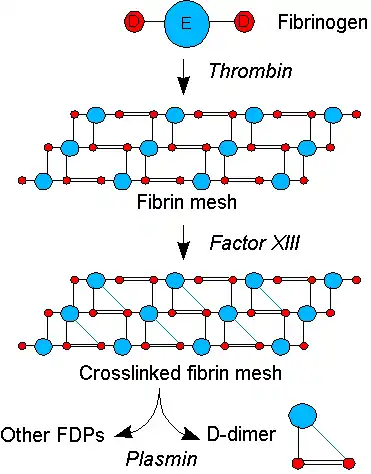 پلاسمین آنزیم اصلی فیبرینولیز است که گردش میکند، ژل فیبرین را در مکانهای خاصی جدا میکند. قطعات حاصل، «پلیمرهای با وزن مولکولی بالا» هستند، که چندین بار توسط پلاسمین هضم میشوند تا منجر به تولید پلیمرهای با وزن مولکولی متوسط و سپس پلیمرهای کوچک (محصولات تخریب فیبرین یا FDPها) شوند. با این وجود، اتصال متقاطع بین دو قطعه D باقی میماند. ساختار D-dimer مولکول ۱۸۰ kDa[2] یا 195 kDa[3] با دو دامنه D، یا مولکول 340 kDa[3] با دو دامنه D و یک دامنهٔ E مولکول اصلی فیبرینوژن است.[1]