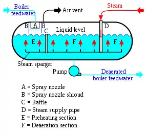 آب بویلر به صورت اسپری به بخش E پاشیده میشود و با بخاری که از طریق پخش کننده به بالا میآید پیش گرم میشود. هدف از به کار بردن نازل اسپری کننده آب بویلر A و بخش پیش گرمکننده این است که آب بویلر را برای جداسازی راحتتر گازهای حل شده در آن تا دمای اشباع گرم و راهی بخش بعدی هوازدایی کند.