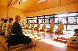 - رینزایی-ذن: فرد با صورت به سمت میانهٔ اتاق مینشیند و در هنگام مراقبه، توجه شخص به شمردن نفسها یا به یک معمای بودایی (کوآن) معطوف میشود.