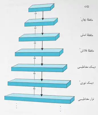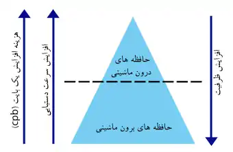 از این شکل ساده معلوم میشود که حافظههای برون ماشینی گسترش و ادامه حافظههای درون ماشینی هستند، با ظرفیت بیشتر و سرعت دستیابی کمتر، و اما هدف ایجاد سلسله مراتب حافظهها این است که سرعت و کارایی سامانههای ذخیرهسازی، در مقابل هزینهای قابل توجیه افزایش یابد. این کارایی باید چنان باشد که حتی الامکان به کارایی سریعترین رسانههای ذخیرهسازی، نزدیک تر شود. در عین حال با هزینهای نزدیک به هزینه رسانههای ذخیرهسازی کندتر. البته افزایش کارایی به راههای مختلفی ممکن است تأمین شود و داشتن یک سلسله مراتب بهینه، یکی از عوامل مؤثر در این افزایش است. درشکل ۲ مفهوم سلسله مراتب حافظهها نشان داده شدهاست. حافظههای موجود در این سلسله مراتب را میتوان به رده اول، رده دوم، رده سوم و گاه رده چهارم تقسیم کرد. یعنی حافظههای درون ماشینی در رده اول، دیسک مغناطیسی در رده دوم، دیسکهای نوری با ظرفیت بالا و نوارهای با ظرفیت بالا در رده سوم و کارت و نوار منگنه شدنی در رده چهارم جای داده میشوند.