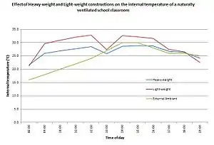 جرم حرارتی در بهبود آسایش ساختمان در هر جا که این نوع از نوسانات درجه حرارت روزانه را تجربه میکند، مؤثر است، چه در زمستان و چه در تابستان. زمانی که از جرم حرارتی به درستی و همراه با طراحی غیرفعال خورشیدی استفاده شود، جرم حرارتی میتواند نقش مهمی در کاهش عمده استفاده از انرژی در سیستمهای گرمایش و خنککننده فعال بازی کند. واژههای سنگین وزن و سبک وزن اغلب برای توصیف ساختمانها با استراتژیهای مختلف جرم حرارتی مورد استفاده قرار میگیرد و بر انتخاب عوامل عددی مورد استفاده در محاسبات بعدی و برای توصیف پاسخ حرارتی آنها به سرمایش و گرمایش تأثیر میگذارد. در خدمات مهندسی ساختمان، استفاده از نرمافزار محاسباتی مدل سازی شبیهسازی دینامیک برای محاسبه دقیق عملکرد زیستمحیطی در داخل ساختمان با ساختارهای مختلف و برای مجموعه دادههای مختلف سالانه آب و هوا مجازاست. این به معمار یا مهندس اجازه میدهد که به بررسی جزئیات رابطه بین سازههای سنگین وزن و سبک وزن و همچنین سطح عایق بندی در کاهش مصرف انرژی برای سیستمهای گرمایش یا سرمایش مکانیکی یا حتی از بین بردن نیاز به چنین سیستمهایی بپردازد.