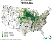 در سال ۲۰۱۰، به دنبال افزایش نسبی از سال ۲۰۰۸ مساحت زیر کشت ذرت برای همه مصارف در آمریکا حدود ۳۵ میلیون هکتار (۹/۸۷ میلیون ایکر) تخمین زده شد. در حدود ۱۴درصد از نواحی که برداشت ذرت انجام شدهاست آبیاری میشوند. در سال ۲۰۱۱، تولید ذرت در حدود ۱٪ یعنی معادل ۱۳ میلیون بوشل (bushel) کاهش یافت. متوسط عملکرد در آمریکا حدود ۱/۱۴۸ بوشل در ایکر تخمین زده شد که پایینترین عملکرد از سال ۲۰۰۵ بود. انتظار میرود تولید ذرت در آمریکا در سال ۲۰۱۲ در اثر خشکی بیسابقهای که همه گیر شدهاست به شدت کاهش یابد. پیشبینی میشود متوسط عملکرد سال ۲۰۱۲ تنها ۱۲۰ بوشل در هر ایکر باشد.