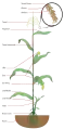 ساقههای ذرت از لحاظ ظاهری شبیه ساقههای بامبو هستند و میانگرهها بهطور معمول به ۱۷ اینچ میرسند. ذرت فرم رشد محدود دارد و برگهای پایینی، برگهای شمشیری وسیعی هستند که عموماً ۱۰۰–۵۰ سانتیمتر طول و ۱۰–۵ سانتیمتر عرض دارند (۴–۲ فوت در ۴–۲ اینچ). ساقهها ایستاده هستند، ۳–۲ متر (۱۰–۷ فوت) ارتفاع دارند و تعداد زیادی گره دارند که معمولاً دارای برگهای بزرگ هستند. زیر این برگها و درست نزدیک ساقه، بلالها به وجود میآیند. آنها روزانه ۳ میلیمتر رشد میکنند.
