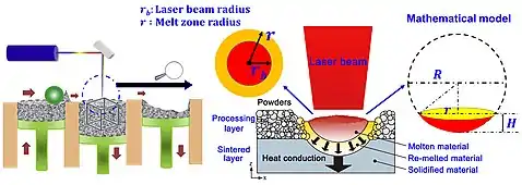 در داخل محفظه ساخت، یک سکوی توزیع مواد و یک سکوی ساخت همراه با یک تیغه وجود دارد که برای انتقال پودر جدید بر روی سکوی ساخت استفاده میشود. این فناوری پودر فلزات را به صورت موضعی و با استفاده از پرتوی لیزر متمرکز به قطعات جامد تبدیل میکند. قطعات به صورت افزودنی و لایه به لایه ساخته میشوند و معمولاً هر لایه ضخامتی برابر ۲۰ میکرومتردارد.[5]