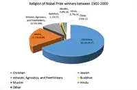 - Baruch A. Shalev, 100 Years of Nobel Prizes (2003),Atlantic Publishers & Distributors , p.57: between 1901 and 2000 reveals that 654 Laureates belong to 28 different religion. Most 65.4% have identified Christianity in its various forms as their religious preference. While separating Roman Catholic from Protestants among Christians proved difficult in some cases, available information suggests that more Protestants were involved in the scientific categories and more Catholics were involved in the Literature and Peace categories. Atheists, agnostics, and freethinkers comprise 10.5% of total Nobel Prize winners; but in the category of Literature, these preferences rise sharply to about 35%. A striking fact involving religion is the high number of Laureates of the Jewish faith - over 20% of total Nobel Prizes (138); including: 17% in Chemistry, 26% in Medicine and Physics, 40% in Economics and 11% in Peace and Literature each. The numbers are especially startling in light of the fact that only some 14 million people (0.02% of the world's population) are Jewish. By contrast, only 5 Nobel Laureates have been of the Muslim faith-0.8% of total number of Nobel prizes awarded - from a population base of about 1.2 billion (20% of the world‘s population)