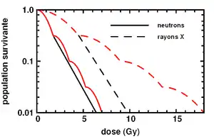 - یک شتاب دهندهٔ ذرات اتمی (شتاب دهنده ذرهای)، تولیدکننده پروتونهای پرانرژی، الکترونها یا یونهای شارژشده. نمونههای زیستی میتوانند با استفاده از یک بیم پهن، مختلط یا بیم یکنواخت، یا با استفاده از یک بیم کوچک یا میکروبیم microbeam))، متمرکز شده به سمت پایین و در اندازههای سلولی یا زیرسلولی تحت تابش قرار گیرند.