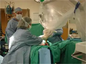 ![]() یک دستگاه رادیو جراحی و تیمی از متخصصان که در حال انجام عمل جراحی بر روی یک بیمار با سرطان رکتال هستند. | |