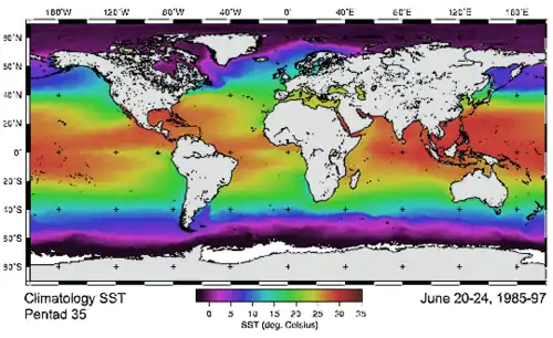 تصویری از دمای سطح دریا در جهان که توسط ماهوارههای NOAA و AVHRR برداشت شده است.