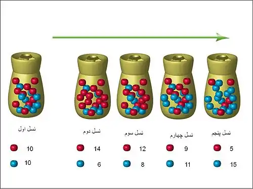 تصور کنید که تعداد ۲۰ مهره رنگی درون یک کیسه بریزیم. نیمی از این مهرهها آبی و نیمی از آنها قرمز هستند. فرض ما بر این است که رنگ آبی و قرمزهر یک نمایشگر یک الل از یک ژن هستند. فرزندان تولید شده از این نسل را در کیسه شماره دو قرار میدهیم. حال بهطور تصادفی یک مهره از کیسه شماره یک خارج مینماییم. بر اساس رنگ مهره (انرا مهره والد مینامیم) یک مهره هم رنگ در کیسه دوم قرار میدهیم ( مهره فرزند) و مهره والد را دوباره به کیسه شماره یک برمی گردانیم. این کار را ۲۰ بار تکرار میکنیم تا کیسه دوم نیز حاوی ۲۰ مهره رنگی گردد. بدیهی است که برخی از مهرههای کیسه نخست ممکن است چندین بار انتخاب شده باشند (والدین چند فرزندی) یا این که به هیچ روی انتخاب نشده باشند( بدون فرزند). رنگ مهرههای کیسه دوم کاملاً تصادفی است. حال اگر این آزمایش را چهار بار دیگر بروی نسلهای بعدی تکرار کنیم ممکن است به نتایجی مانند شکل شماره یک برسیم. تعداد مهرههای قرمز و آبی (اللهای یک ژن) ممکن است در نسلهای پیاپی دچار نوسان شوند. این حالت همان رانش ژنتیکی است. حال تصور کنید که تعداد مهرههایی که در کیسه نخست قرار میدهیم بسیار محدود باشند (همانند جمعیت کوچک یک گونه جانوری در حال انقراض) . برای مثال اگر تنها هشت مهره (چهار مهره آبی و چهار مهره قرمز) در کیسه قرار دهیم احتمال این که پس از چندین نسل تنها یک رنگ مهره داشته باشیم بالاست. برای مثال اگر هیچ والد قرمز رنگی فرزندی به وجود نیاورد و تمام مهرههای فرزند، آبی رنگ باشند الل قرمز منقرض میشود. به این حالت تثبیت گفته میشود .در مثال بالا، پس از تثبیت رنگ آبی (نسل چهارم در شکل دوم) کلیه نسلهای بعدی آبی خواهند بود و الل قرمز از میان میرود.