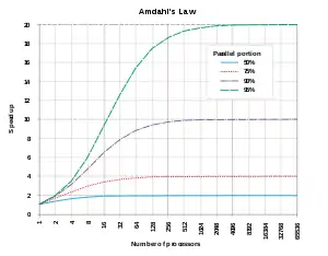 افزایش سرعت بالقوه یک الگوریتم در یک سیستم رایانش موازی توسط قانون آمدال بدست میآید:[15]