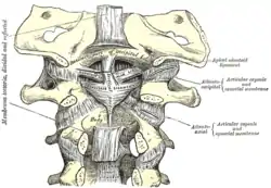![]() Median sagittal section of two lumbar vertebræ and their ligaments. (Posterior longitudinal ligament runs vertically at center left.) | |