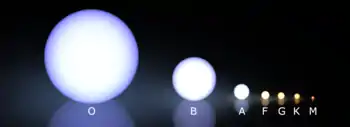 | B | ۱۰٬۰۰۰–۳۰٬۰۰۰ K | آبی متمایل به سفید | سفید آبی | ۱۸ M☉ | ۷ R☉ | ۲۰٬۰۰۰ L☉ | متوسط | ۰٫۱۳٪ |