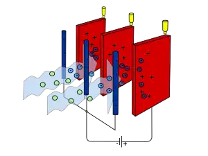 فیلترهای الکترواستاتیک معمولاً از سیمهای نازکی تحت عنوان الکترودهای تخلیه تشکیل شده اند که به طور منظم بین صفحات با بار مخالف یعنی الکترودهای جمع آوری قرار گرفته اند. با اعمال ولتاژ بالا به این الکترودها، میدان الکتریکی قوی ایجاد میگردد که موجب باردار کردن ذرات و سپس جذب آنها توسط صفحات جمع آوری می شود. بدین ترتیب از طریق فیلترهای الکترواستاتیک می توان برای تصفیه ی هوا استفاده نمود.