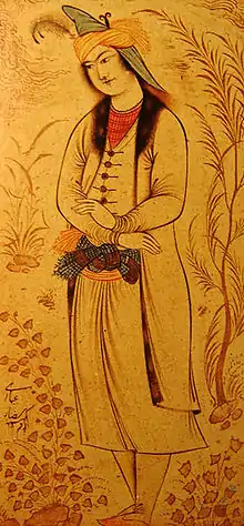 ![]() نگارهای از رضا عباسی که بعد از مرگ او و توسط جانشینش، معین مصور کشیده شدهاست. | |